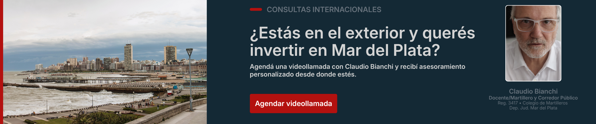 ¡Hola! soy Claudio Bianchi, Martillero y Corredor Público con experiencia en el mercado inmobiliario de la hermosa ciudad de Mar del Plata. Desde el año 2011, he tenido el privilegio de trabajar de cerca con personas y familias que desean realizar la venta de sus viviendas, ya sea una casa o un departamento.